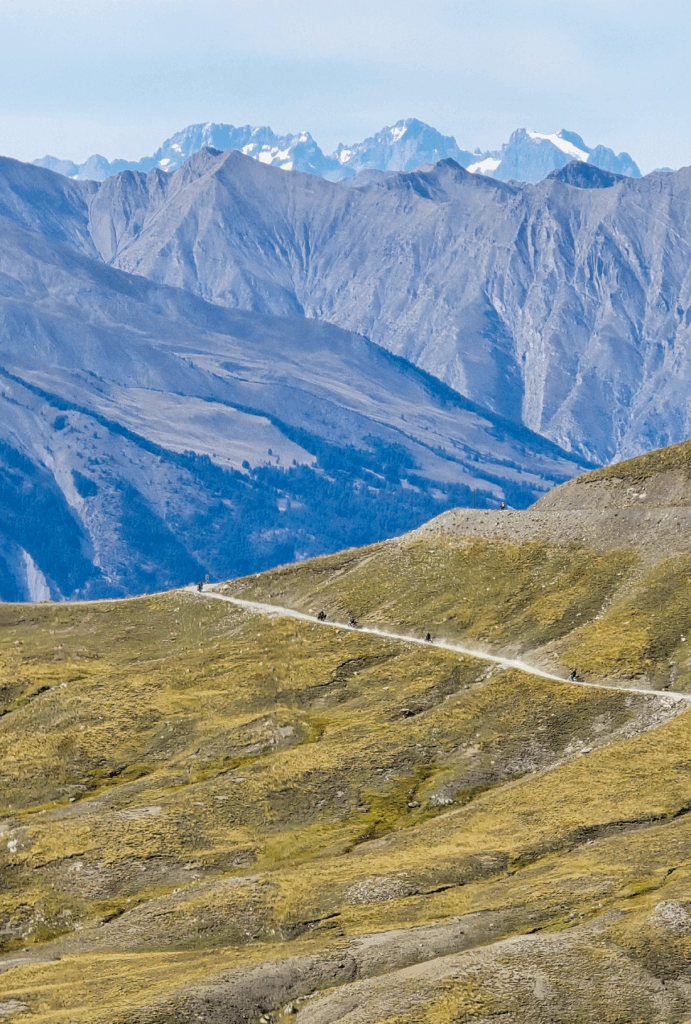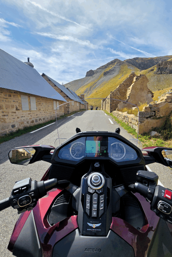 La Goldwing filtre les raccords, absorbe les irrégularités, rétrograde en douceur. Puis, au détour d’un virage, surgit le Camp des Fourches, hameau militaire abandonné à plus de 2 200 mètres. Silence total. Deux époques se croisent : celle des soldats d’hier et celle du voyage à moto d’aujourd’hui.